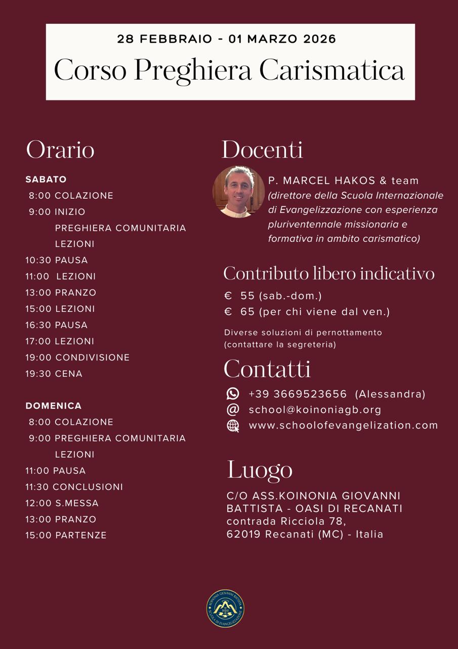 Il programma 2025-2026 della Scuola di evangelizzazione si svolgerà nei fine settimana a partire dalle 19:00 del venerdì fino alle 15:00 della domenica.